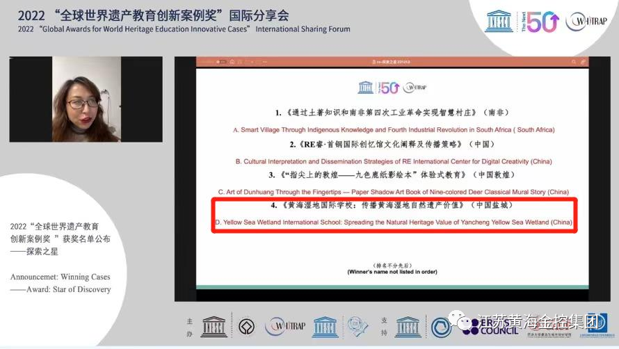 12月13日,在2022“全球世界遗产教育创新案例奖”国际分享会上黄海湿地研究院公司申报的“黄海湿地国际学校:传播黄海湿地自然遗产价值”项目,被评为2022全球世界遗产教育创新案例奖“探索之星奖”。